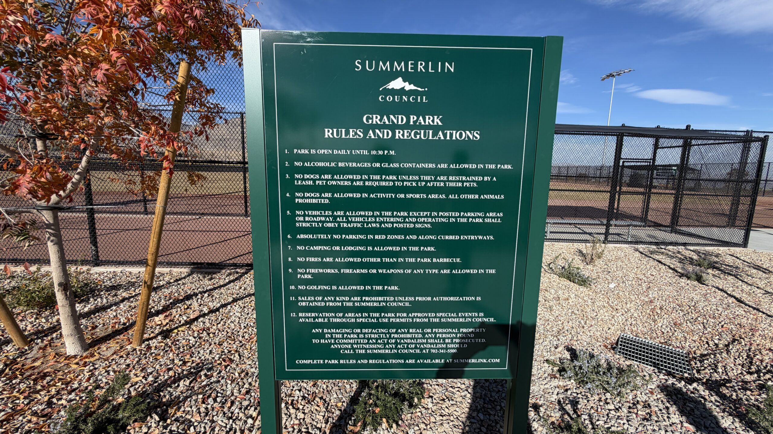 - Any damaging or defacing of any real or personal property in the park is strictly prohibited. Any person found to have committed an act of vandalism shall be prosecuted. Anyone witnessing any act of vandalism is requested to call the Summerlin Council at 702-341-5500.