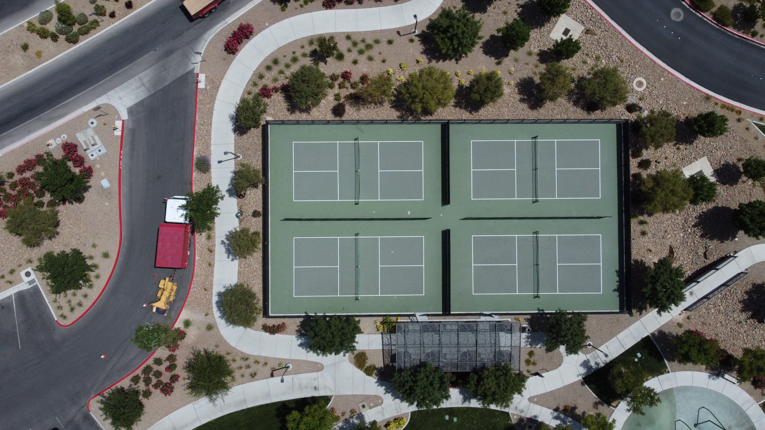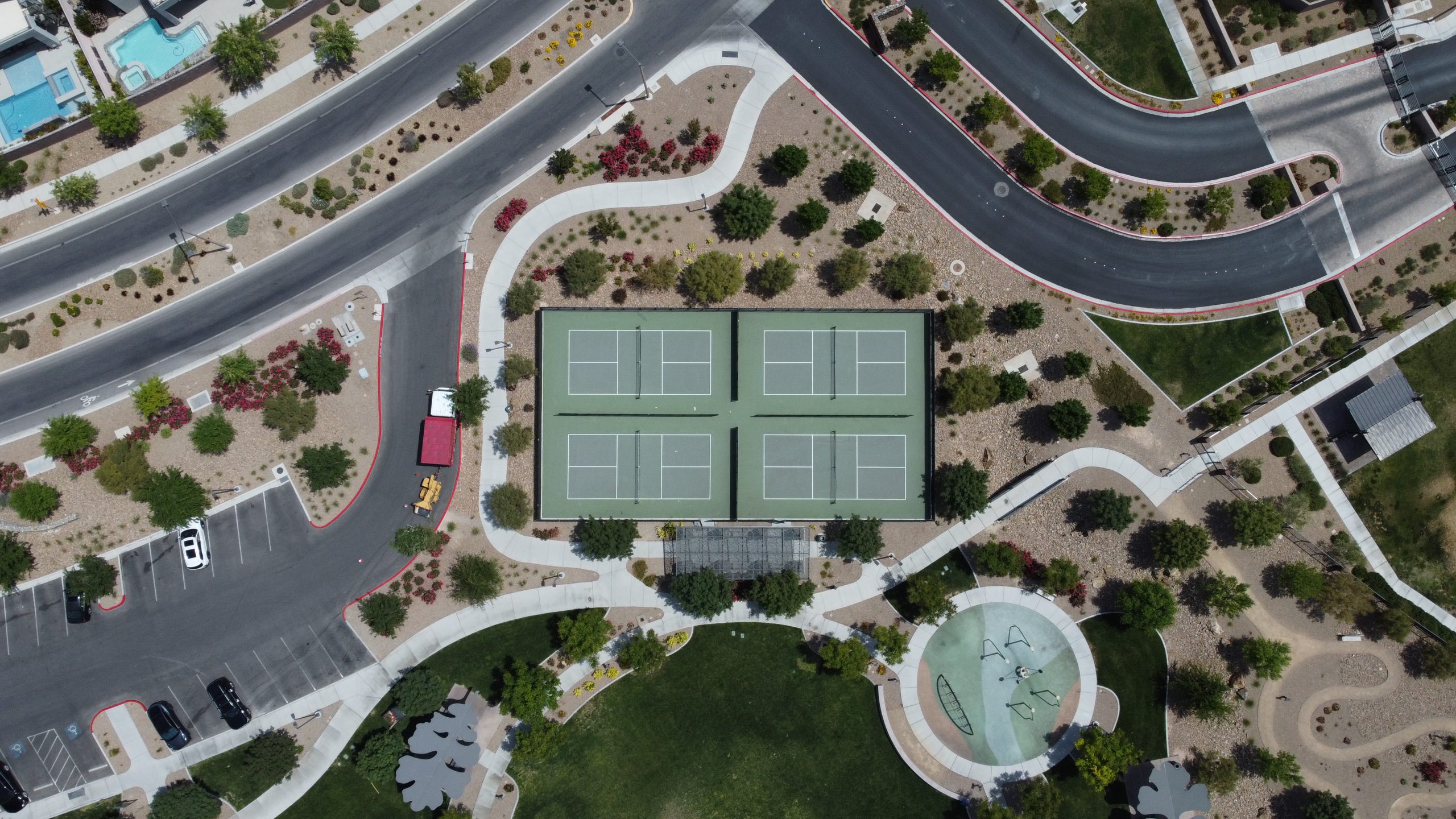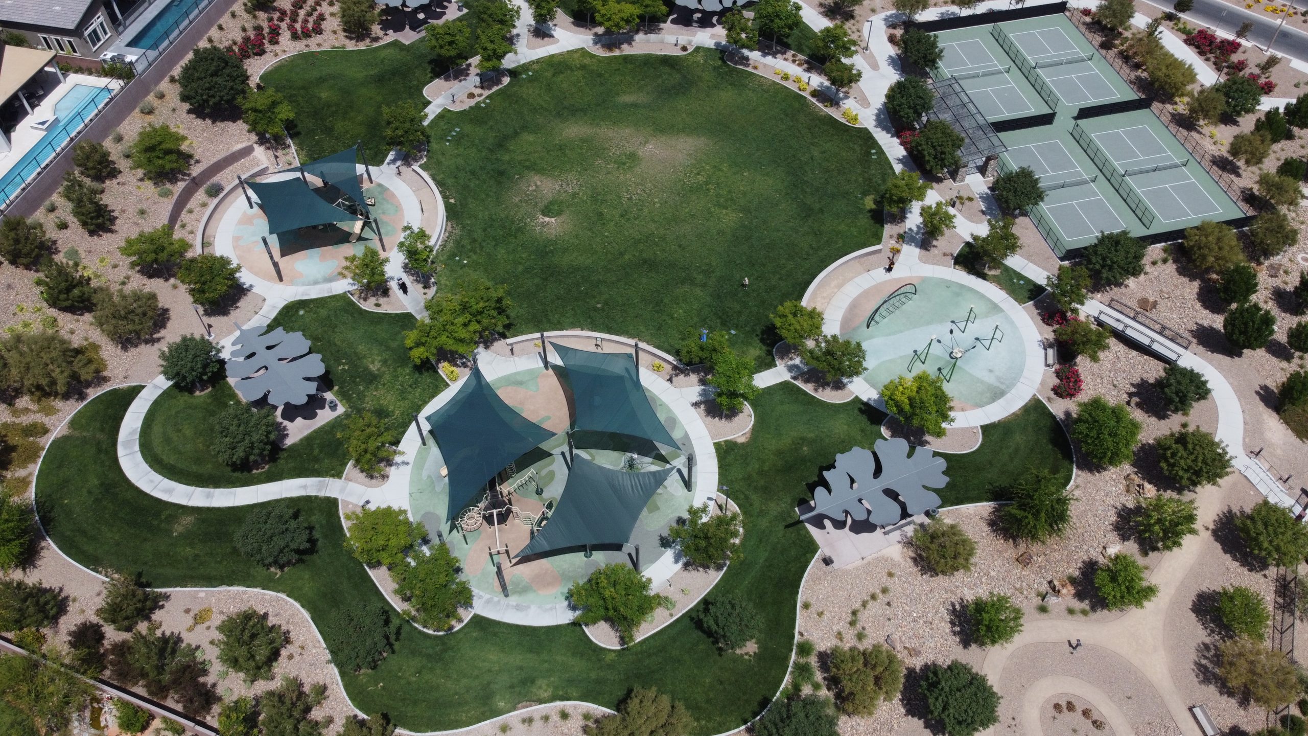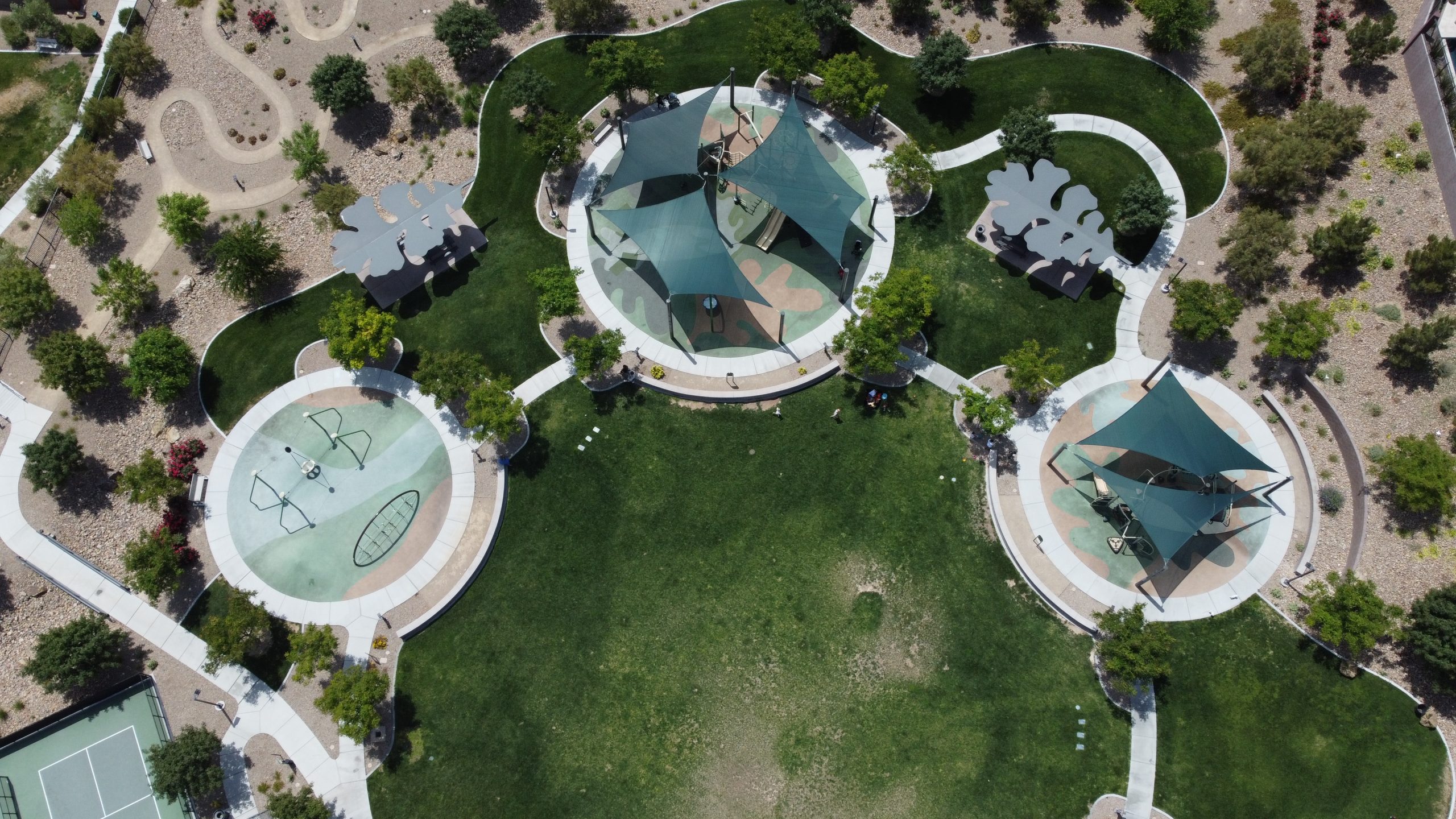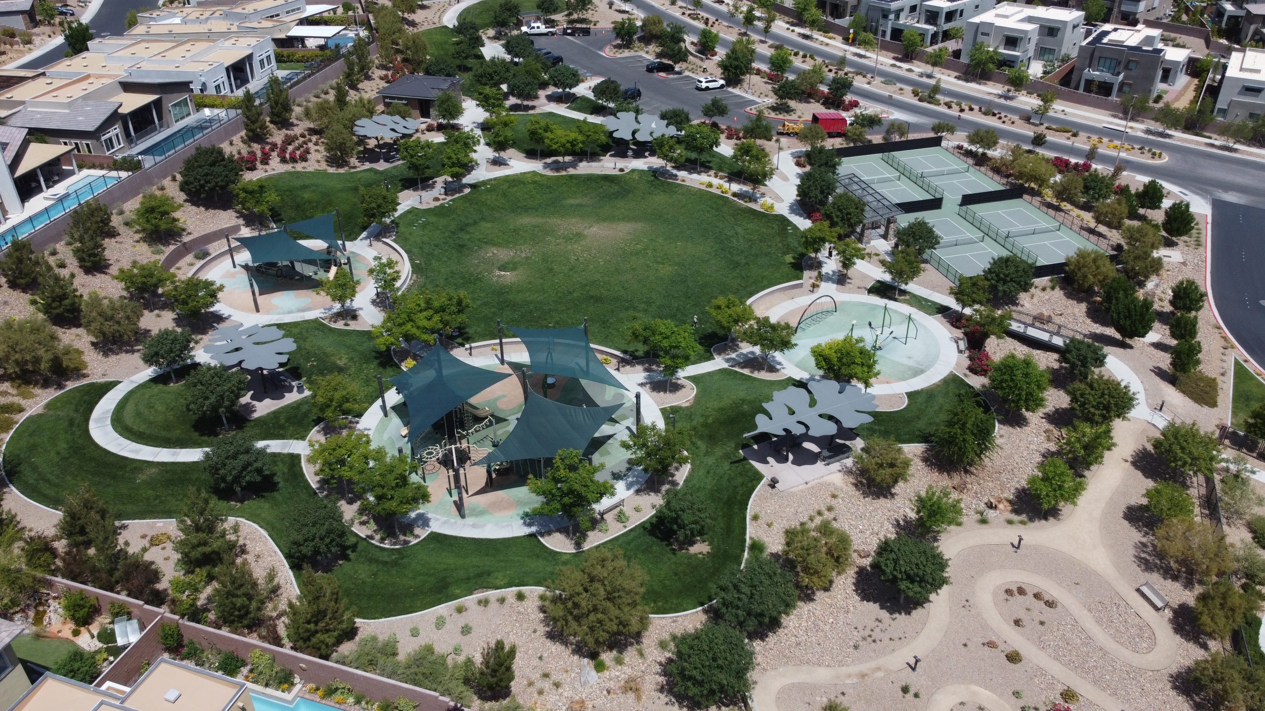Oak Leaf Park boasts four pickleball courts, two shaded playgrounds, climbing tower, central lawn and open play area, shaded picnic pavilions and even a demonstration garden.