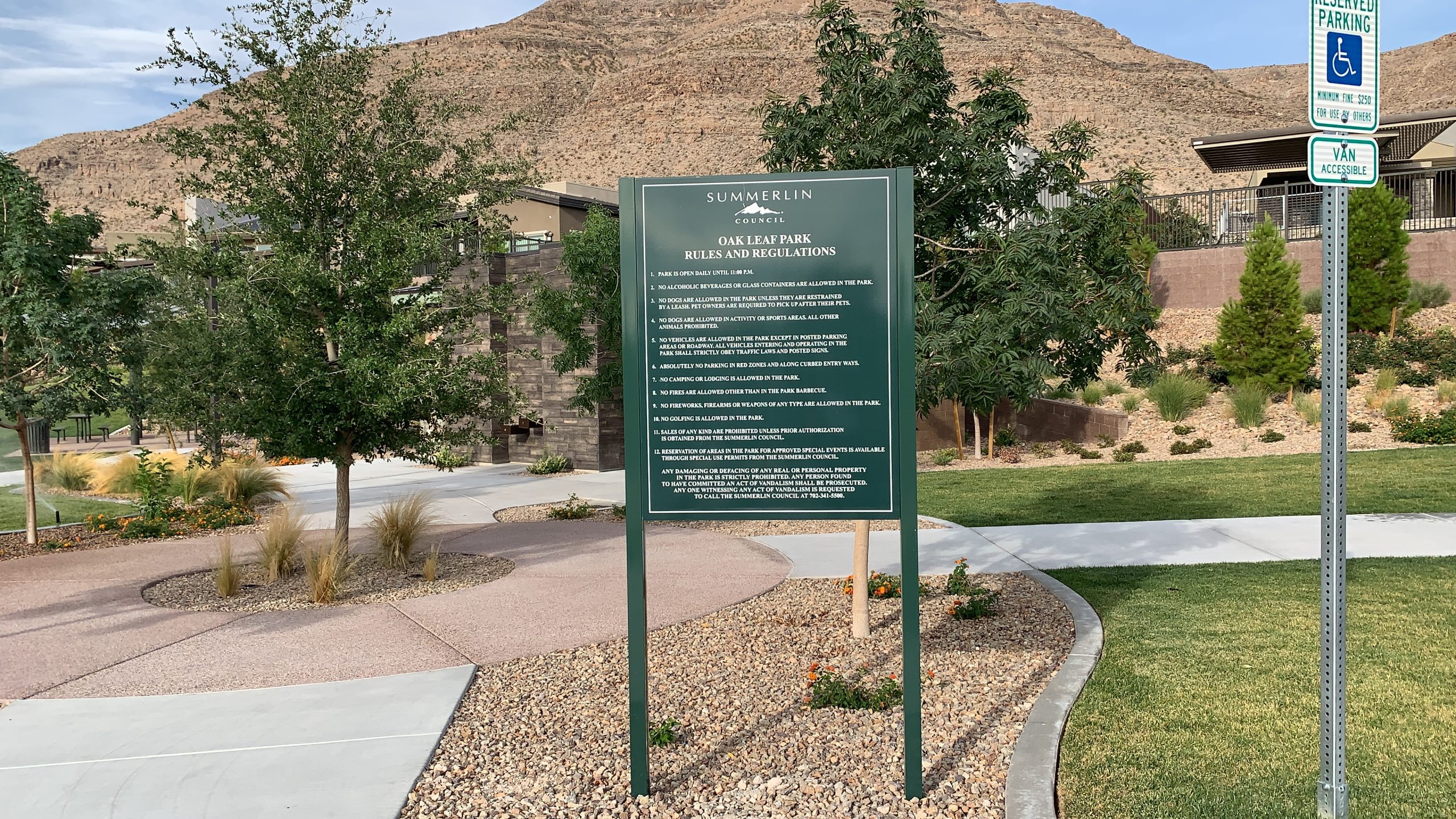 - Any damaging or defacing of any real or personal property in the park is strictly prohibited. Any person found to have committed an act of vandalism shall be prosecuted. Anyone witnessing any act of vandalism is requested to call the Summerlin Council at 702-341-5500.